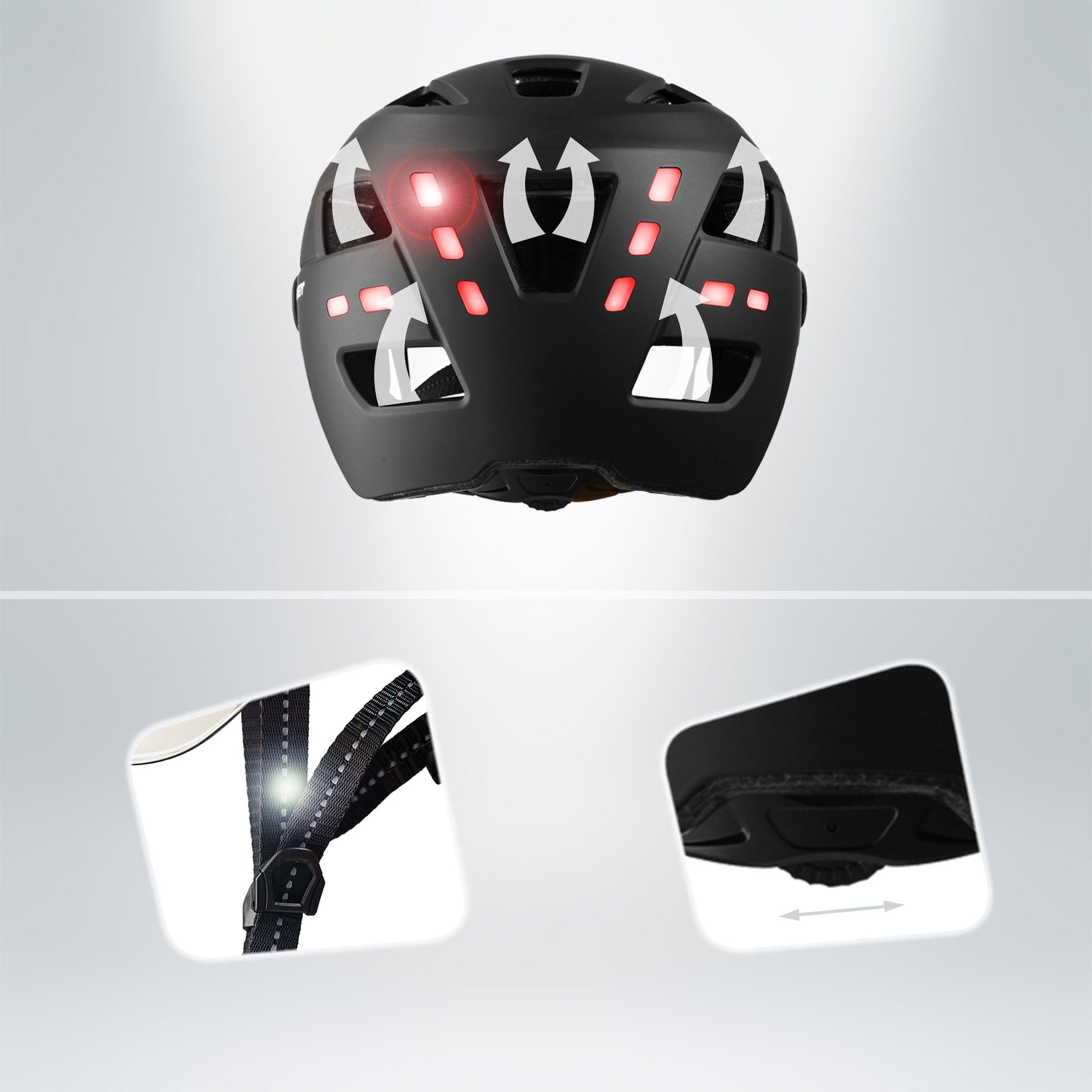The helmet is equipped with integrated front and rear lights, seamlessly built into the design to enhance your visibility. These USB-rechargeable lights ensure that you are always seen, both day and night. Strategically placed, they provide reliable illumination and are easy to recharge, allowing you to keep your focus on the road ahead.